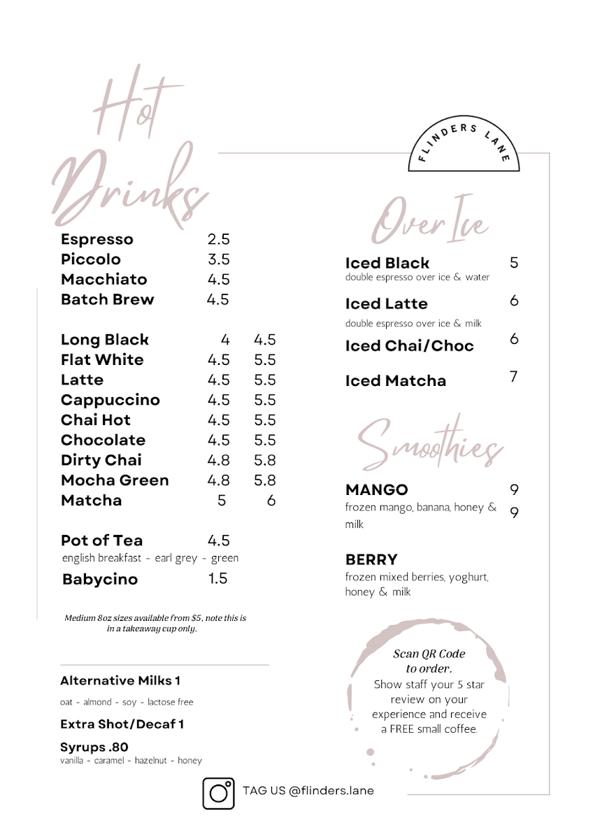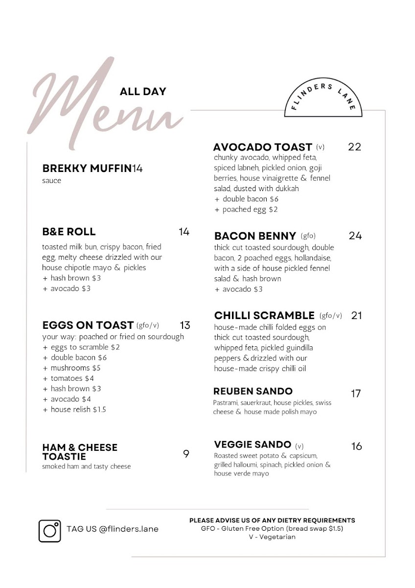 Welcome to Flinders Lane Cafe Menu, where every bite is a delightful journey through fresh, flavorful dishes. Located in the heart of Maroochydore, this charming cafe offers an array of mouthwatering options that cater to every taste. Whether you're in the mood for a light breakfast, a hearty lunch, or a sweet treat, the menu is packed with choices that never disappoint.